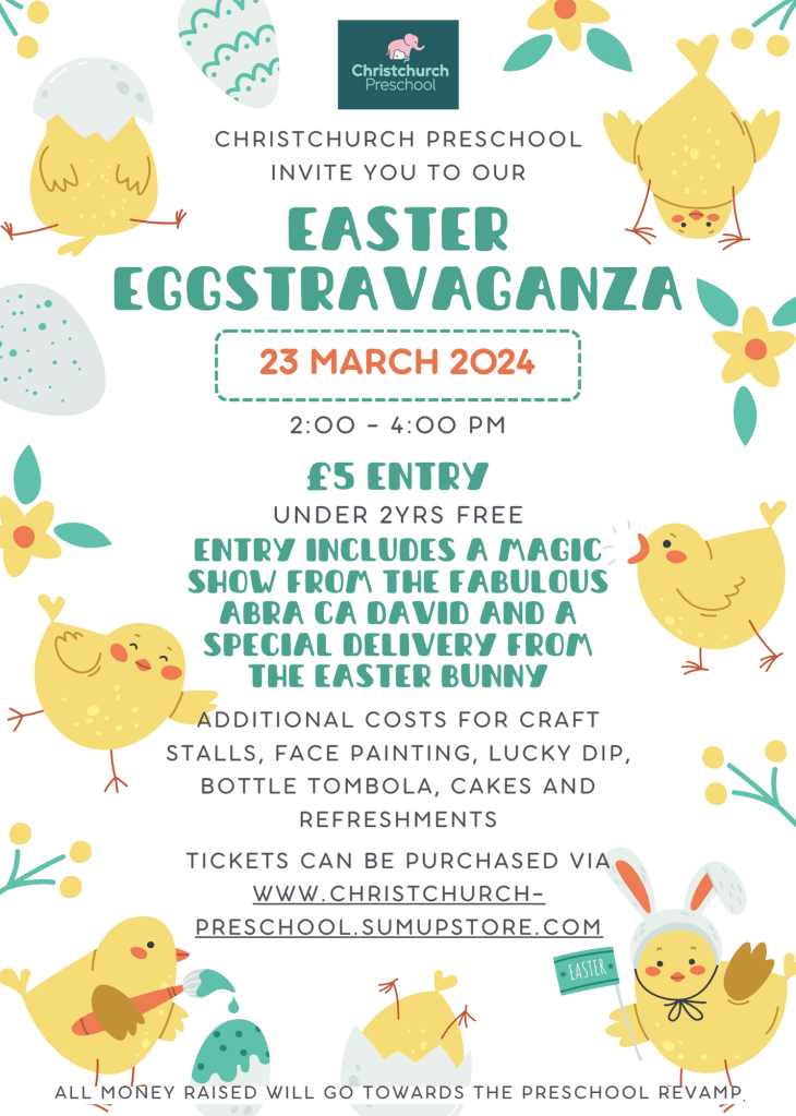 Easter Eggstravaganza 13th Mar 2024 emilygooch1084c50a68 Tickets can be purchased via https://christchurch-preschool.sumupstore.com/ Share this: Click to share on X (Opens in new window) X Click to share on Facebook (Opens in new window) Facebook Like Loading... Related