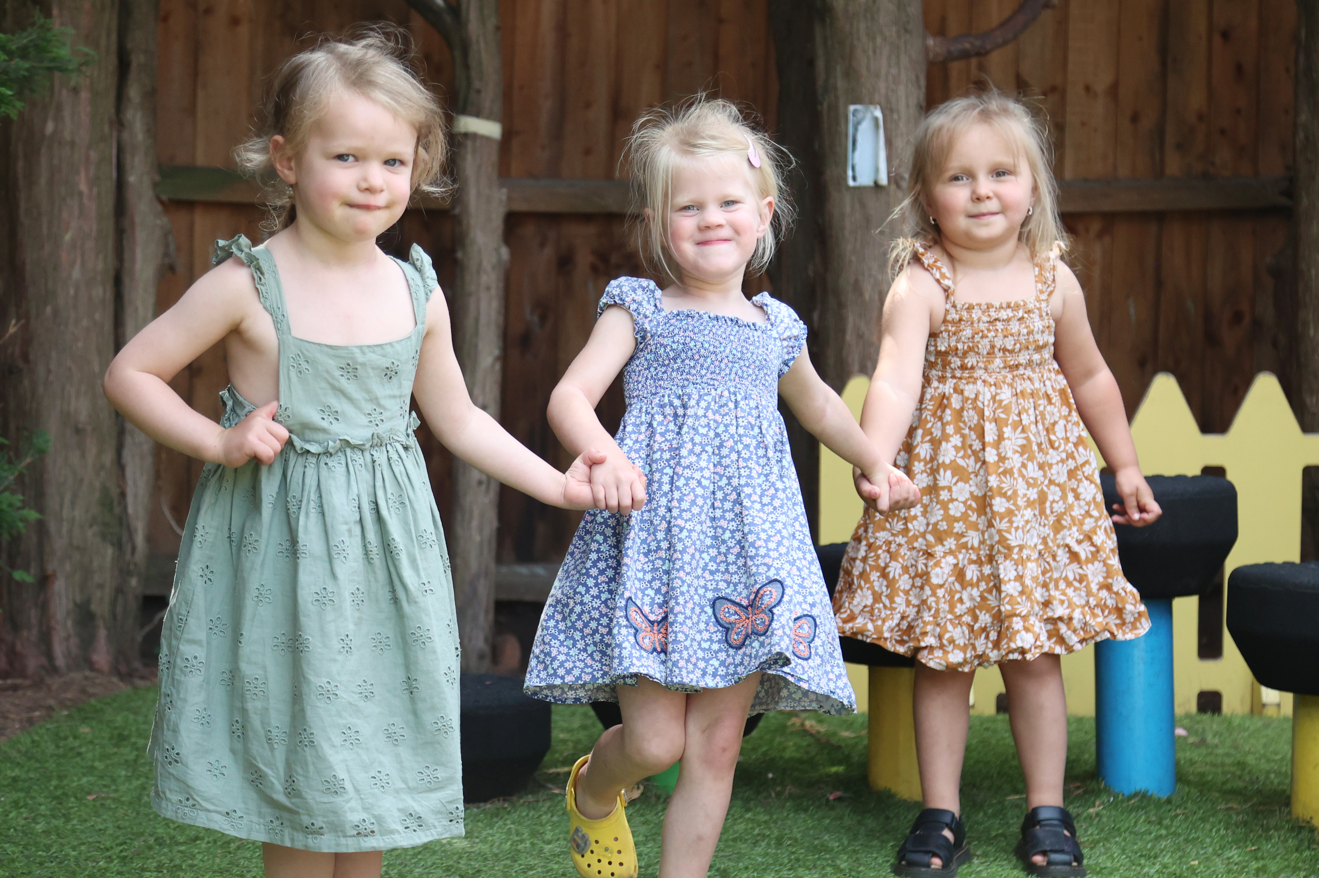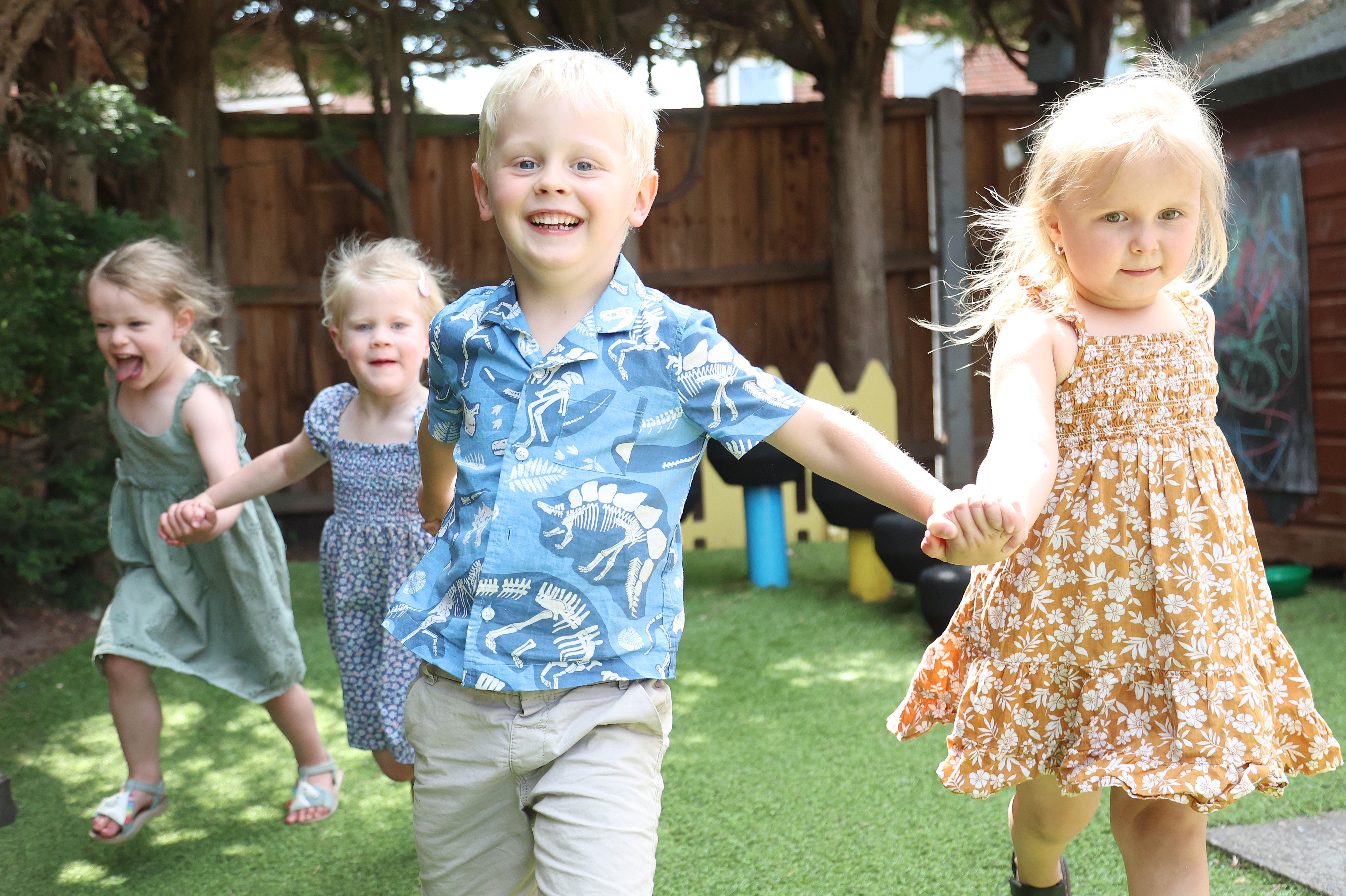 Children enjoy their pre-school day. They wave goodbye to parents and excitedly skip to the gate, where they are greeted by happy, smiling staff.